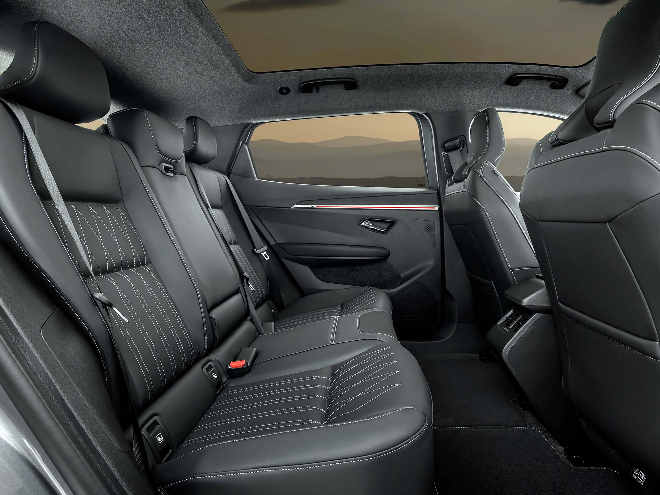 Liniile orizontale, accentuate de inserții satin argintiu care traversează întregul bord și panourile portierelor, creează senzația de spațiu și deschidere. Configurația cu două rânduri de scaune asigură loc pentru cinci pasageri, cu accent pe confort și funcționalitate. Scaunele au un design ergonomic, oferind suport lateral îmbunătățit și tapițerie cu cusături în model diamant, care adaugă un aer sofisticat și elegant.