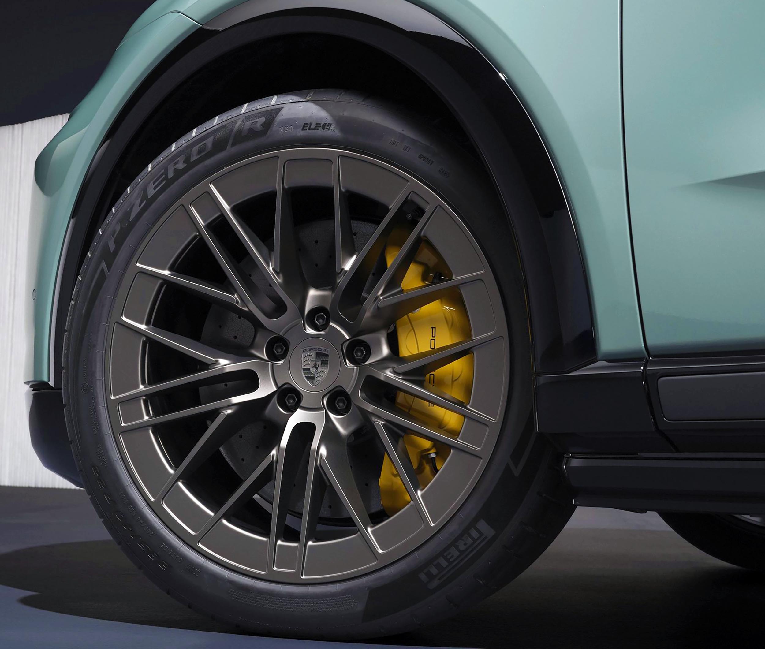 În utilizarea zilnică, aproximativ 97% din toate operațiunile de frânare pot fi realizate exclusiv de motoarele electrice (frânare regenerativă), ceea ce înseamnă că frânele mecanice pe fricțiune intervin extrem de rar. Pentru cei care solicită performanța la maximum, varianta Cayenne Turbo oferă opțional Porsche Ceramic Composite Brake (PCCB), asigurând o putere de oprire pe măsura forței de accelerare.
