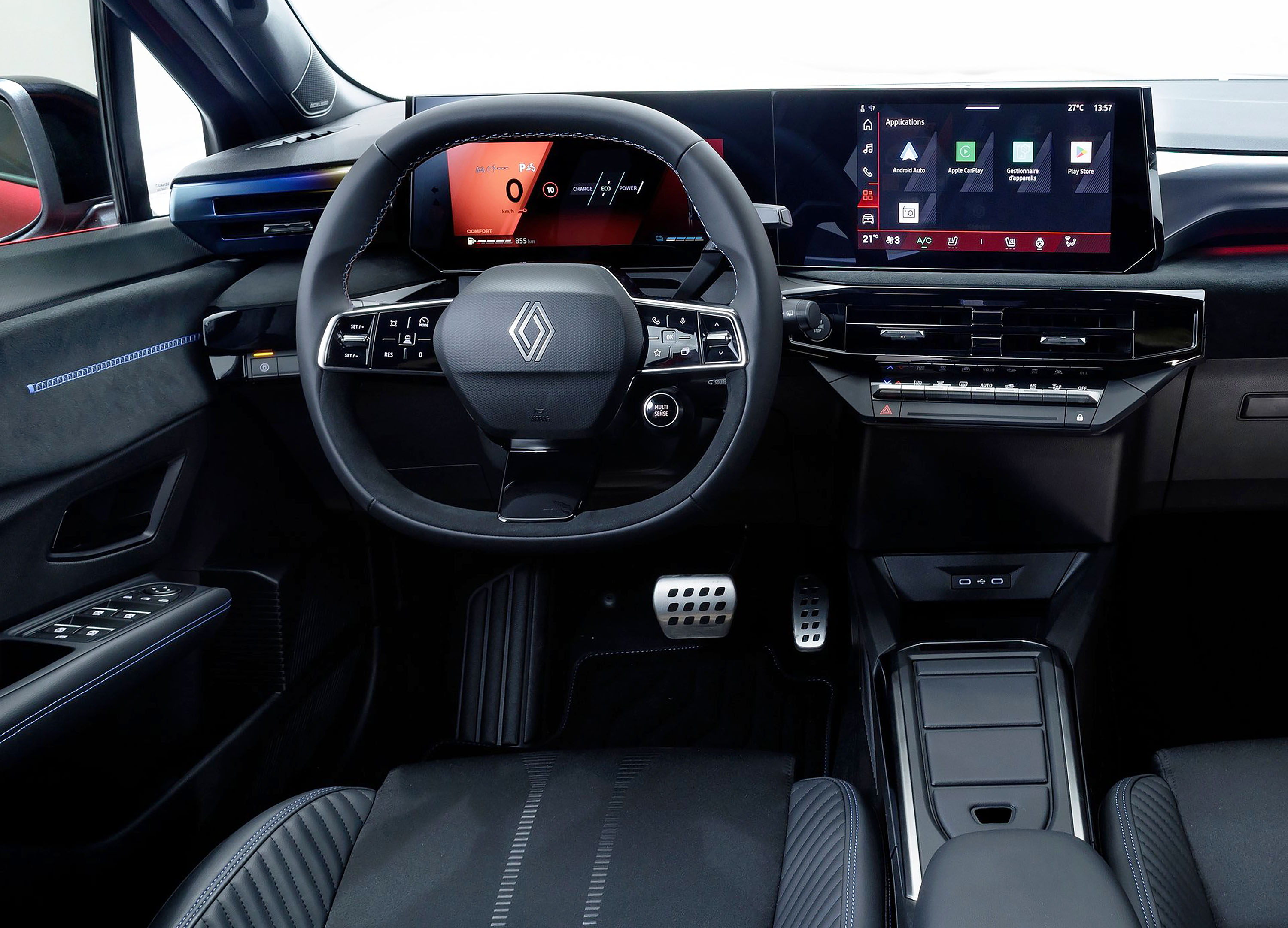 Partea frontală este, probabil, cea mai îndrăzneață schimbare. Noua grilă de mari dimensiuni este decorată cu motive diamantate, inspirate direct din logo-ul Renault, iar farurile LED reproiectate integrează o semnătură luminoasă unică, sub forma unui „V” stilizat care evocă forma diamantului. Blocurile optice sunt montate într-o carcasă neagră lucioasă, oferind un contrast elegant cu restul caroseriei și o expresie puternică, aproape provocatoare.